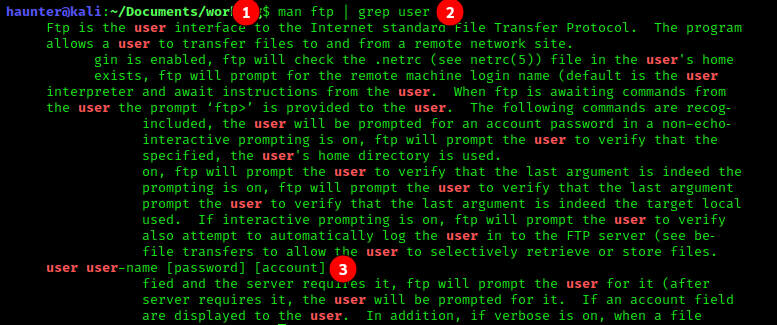 We run man for ftp (1), but for the sake of expediency we then pipe the output and use grep to search through the output for the term "user" (2). grep is an extremely useful tool used for searching for patterns, and this is a very basic use case involving a simple string. At the bottom of our filtered output (3), we can see that there is an FTP-specific command user. This command is entered on the ftp interface and will then prompt for a username to login with.