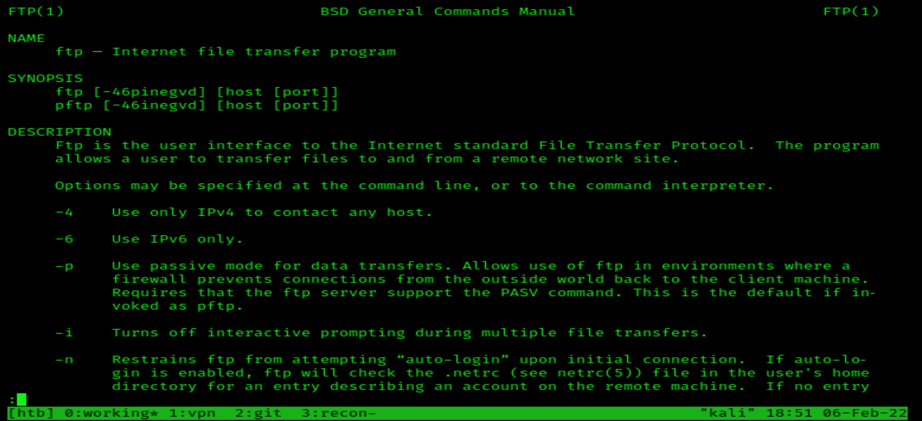 The next couple of questions are related to FTP. Let’s run man ftp | less.