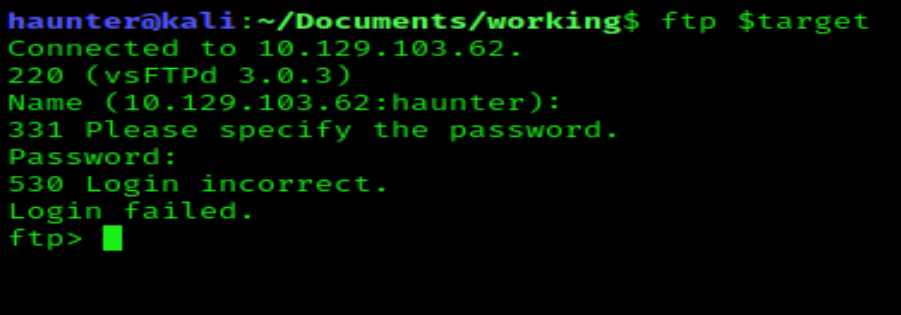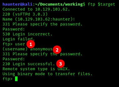 usercommand at theftpinput prompt. - The prompt then asks for a username, we enter