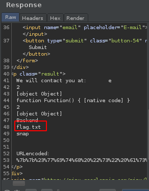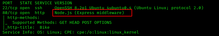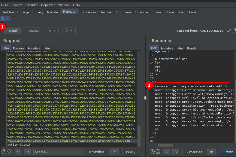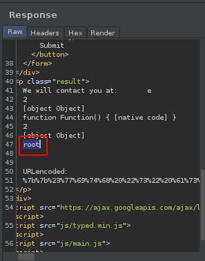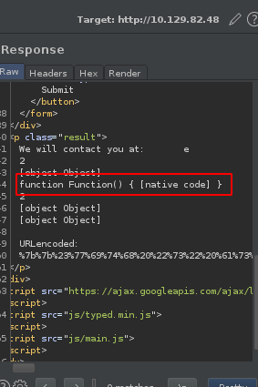 1. Scan results indicate there is a webserver running Node.js. We identify which framework is running using `SSTI`; the framework is `Handlebars`.2. Capture the POST request via `Burpsuite` and load the request into Repeater.