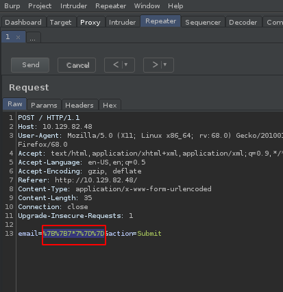 We need to copy and paste the encoded payload from the Decoder tab to the Repeater, specifically the POST variable ‘email’.