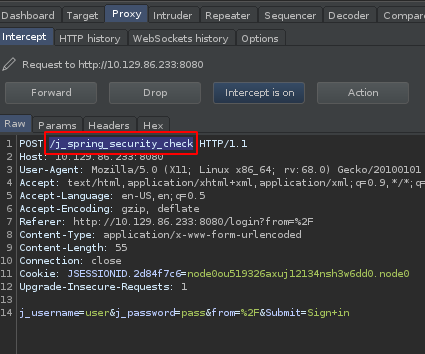 As mentioned earlier, the value of LOGIN_URL can be determined with a proxy. I went back to the Jenkins login page and turned on FoxyProxy to route the POST data to Burpsuite. After filling in dummy data in the username/password fields and submitting, the data appeared on the Intercept tab. We can see the LOGIN_URL value is in the top line of the POST data.