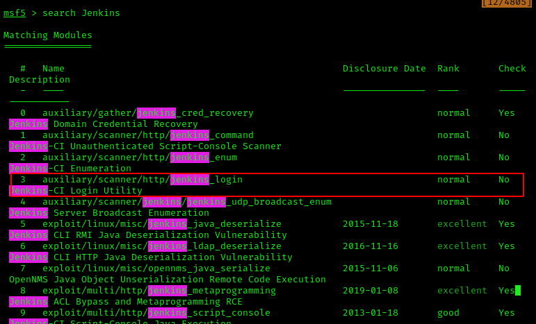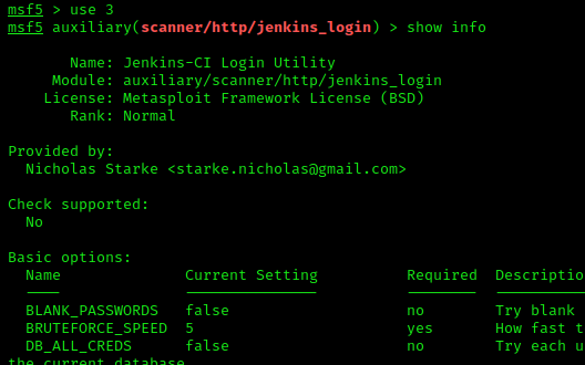 Firstly, I ran search jenkins to verify if there were even any payloads available to target Jenkins. There were actually a few available and module 3 looked very promising.