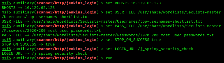LOGIN_URL- this is the address of the webpage the login form SUBMITS to. We have the/loginURL, but down below you can see this is not the URL we need.PASS_FILE- the local path to a password file.RHOSTS- thetarget'sIP address.STOP_ON_SUCCESS- once a correct username/password combo is found, we want to stop the tool. We just need one credential.USER_FILE- the local filepath to a file of usernames.