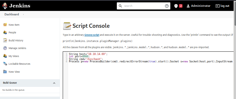 5. Navigate to the Scripts page once logged in. Google for a Groovy script reverse shell payload. Edit to include your `tun0` IP and port `8000`