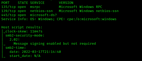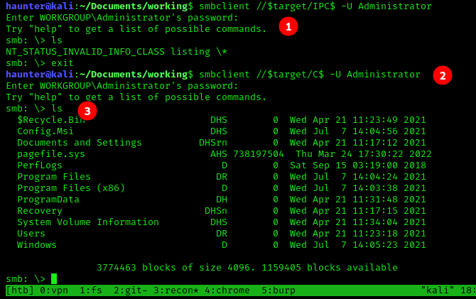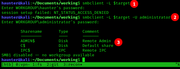 1. Scan with the `-Pn` switch.2. Enumerate the `smb` shares with `smbclient -L $target -U Administrator`