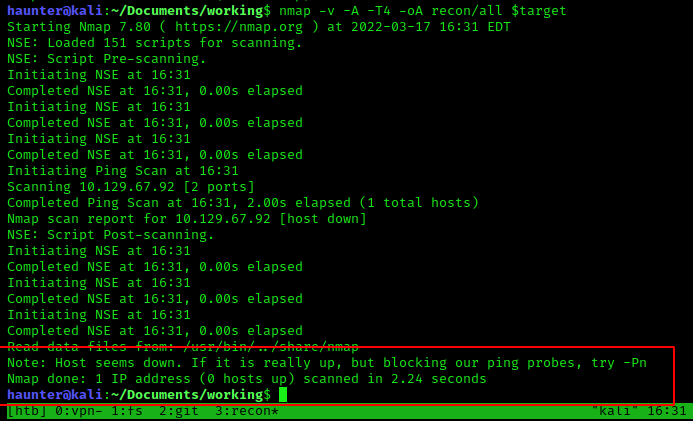 Our modified nmap command now reads nmap -Pn -A -v -T4 -oA recon/all $target