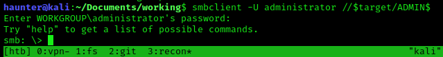 - Using -U Administrator, we were then successfully able to enumerate the shares.