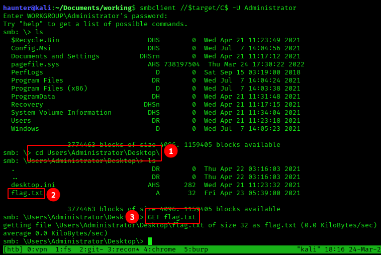 3. Connect to `//$target/C$` and navigate to the admin's desktop