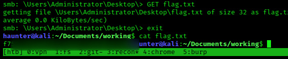 cddown toAdministrator’s Desktop lsrevealsflag.txt- and we download it with